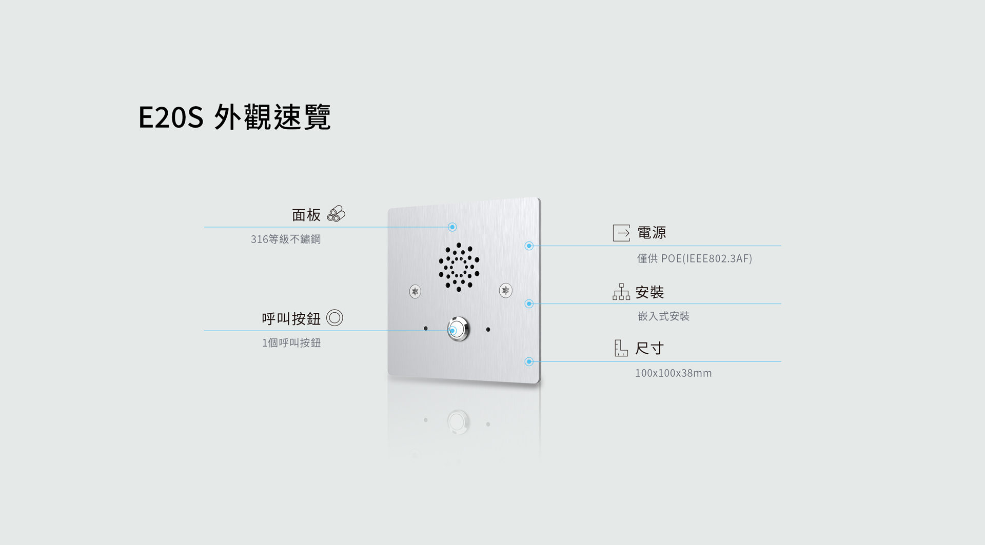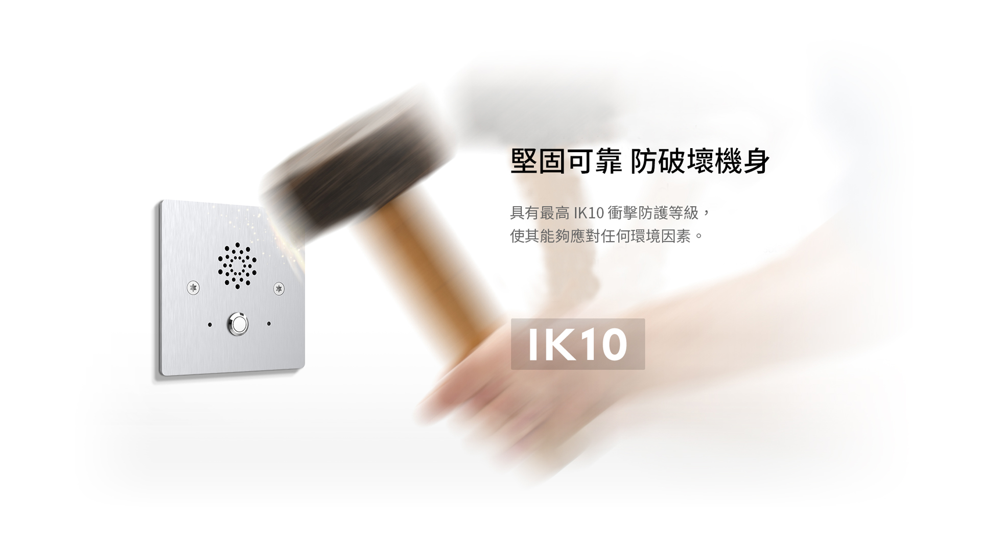 • 316不銹鋼機身 • 1個緊急呼叫按鍵 • 防水等級IP65,防撞等級IK10 • 標準IEEE802.3at POE接入 • 標準SIP協定可輕鬆與SIP PBX整合 • 嵌入方式安裝