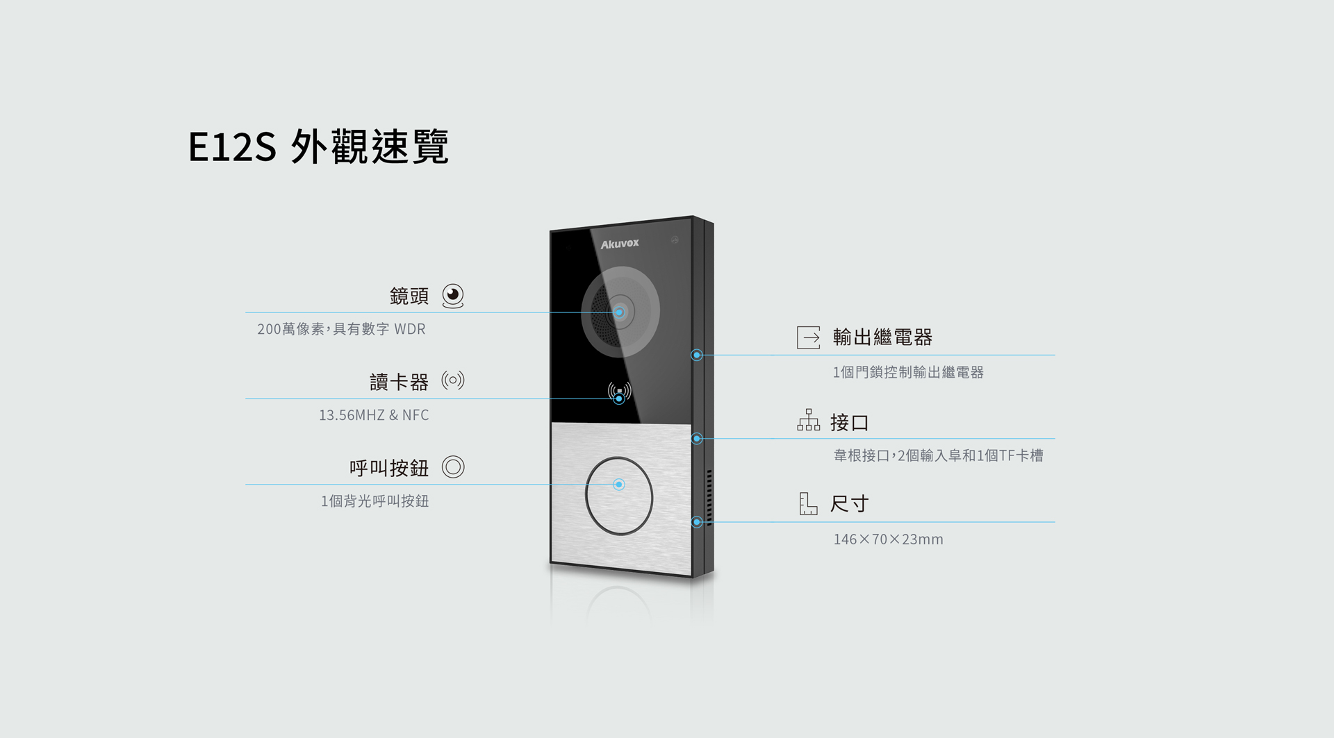 • 塑料材質,防水防塵IP65等級 • 1個帶背光快速呼叫按鍵 • 超廣角鏡頭200萬像素輸出畫面清晰 • 多種開鎖方式包含遠端DTMF、IC/ID卡、藍牙 • 標準IEEE802.3at POE 乙太網線接入電源 • 標準SIP協定可與SIP IP PBX整合使用 • 標準ONVIF功能方便與任何網路監控系統整合 • 通過NCC型式認證(認證字號CCAM23LP1850T3) • 壁掛安裝