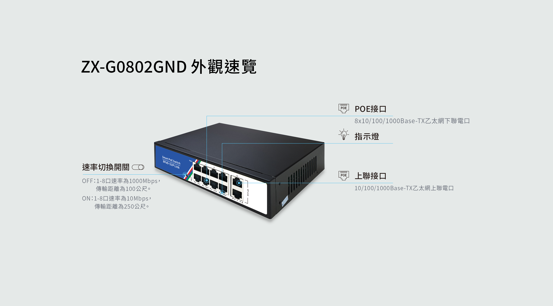 ZX-G0802GND 8口POE網路交換機 (1000Mbps)