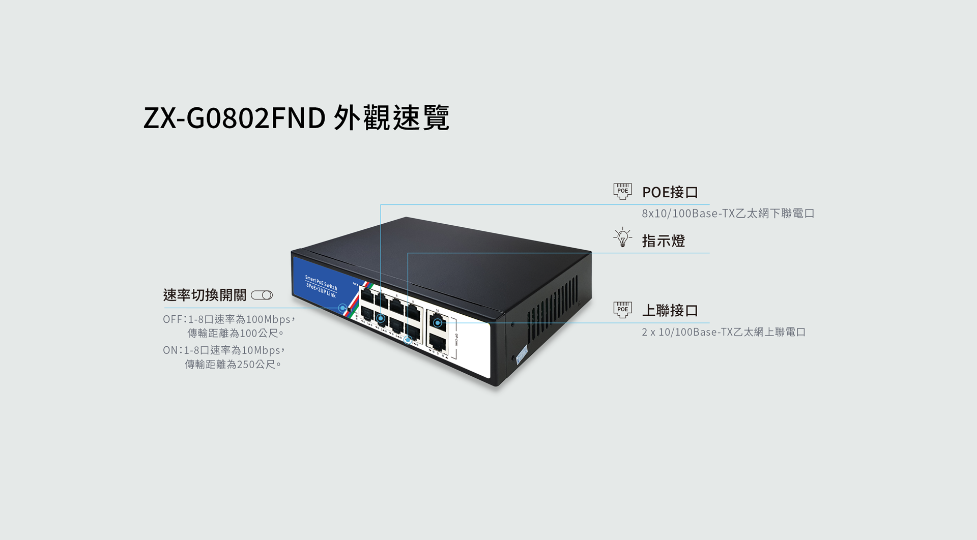 ZX-G0802FND 8口POE網路交換機 (100Mbps)